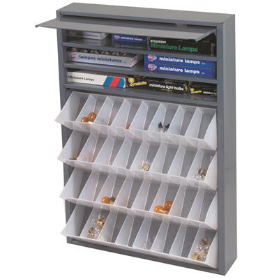 Ideal for the storage and organization of automotive miniature bulbs, fuses, etc. Features 4 durable plastic tilt-out trays with 28 adjustable dividers allowing for the creation of from 4 to 32 compartments. Backup storage shelves are located behind the hinged cover. Can be hung on wall using key holes punched in the back.